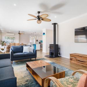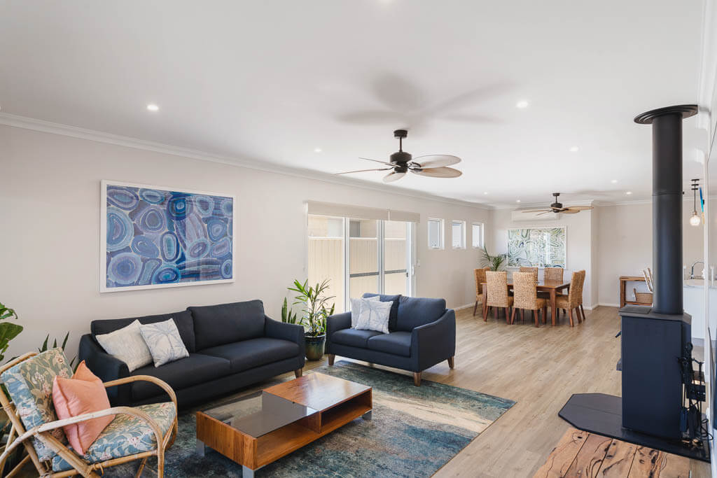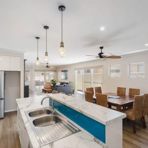 Stylish timber look ceiling fans, island bench lighting, LED lighting.