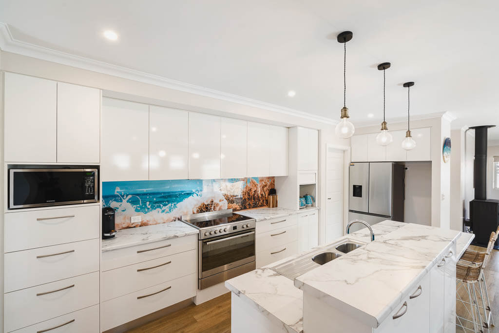 Unique Yallingup beach acrylic splashback, double size fridge recess, excellent size walk in pantry plus a series of custom drawers, cupboards and overhead cabinetry.