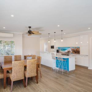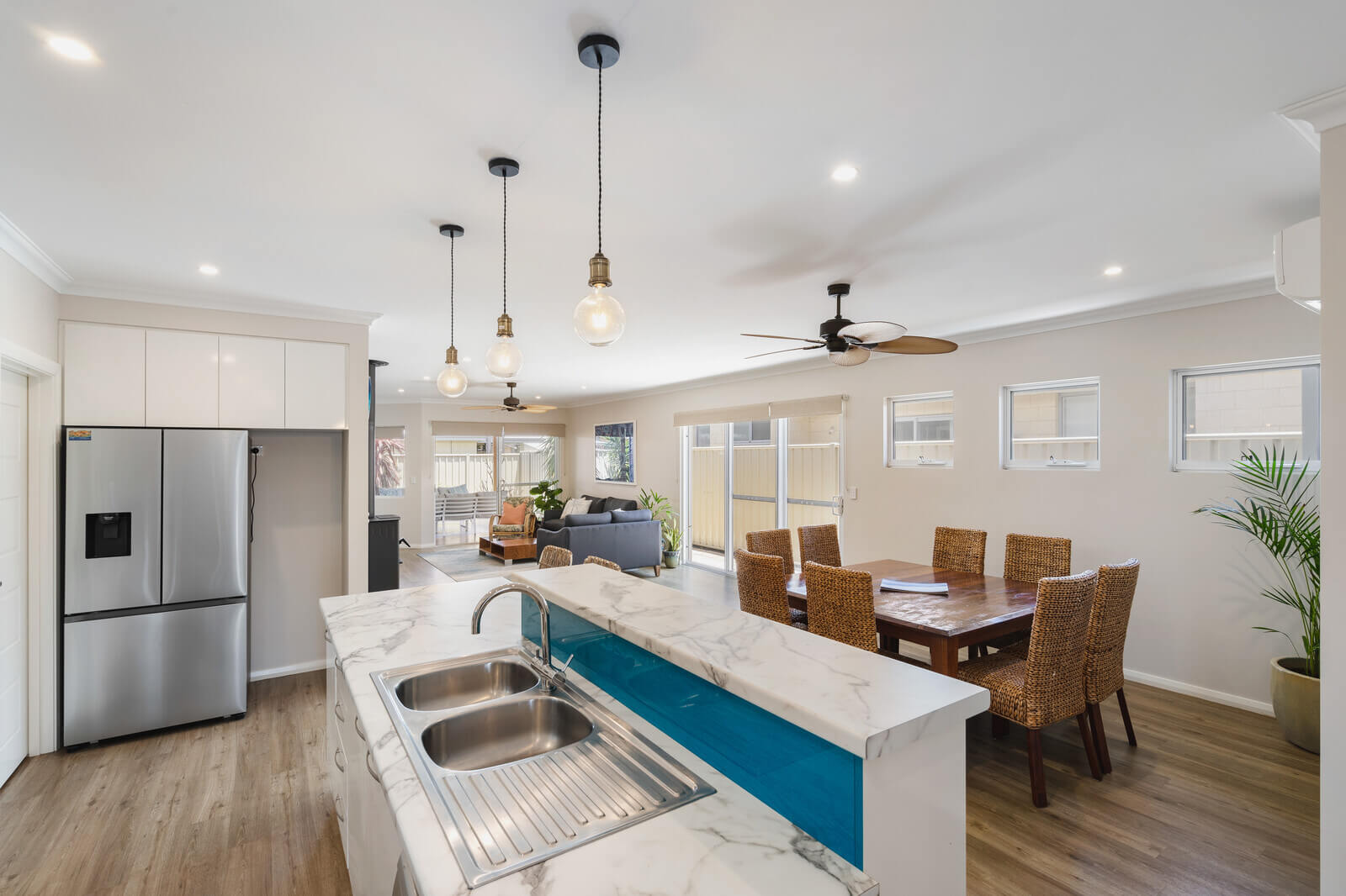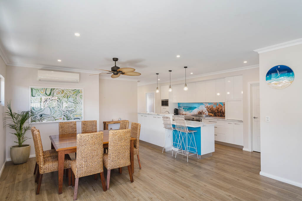 The kitchen features a stylish acrylic image of Yallingup Beach which adds colour and character to the white beach style living zone. The dining and living room are spacious and flowing with an abundance of natural light due to the orientation of the home.”