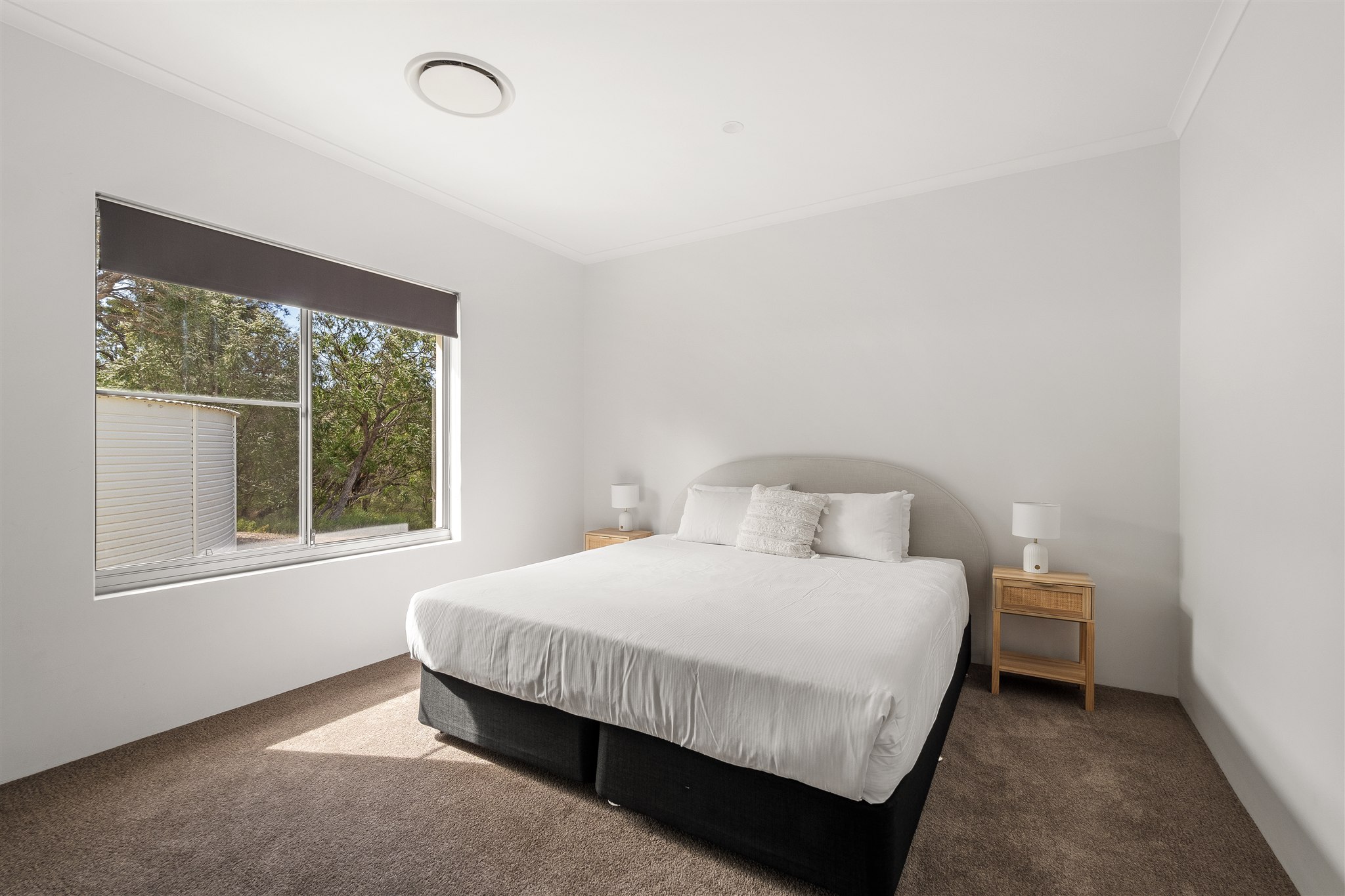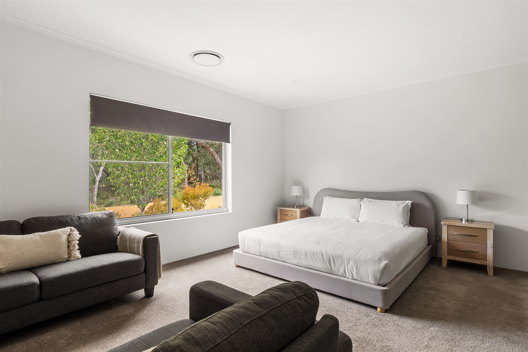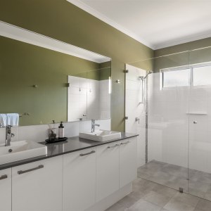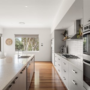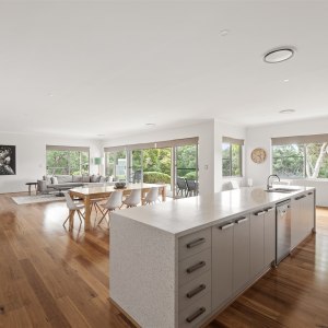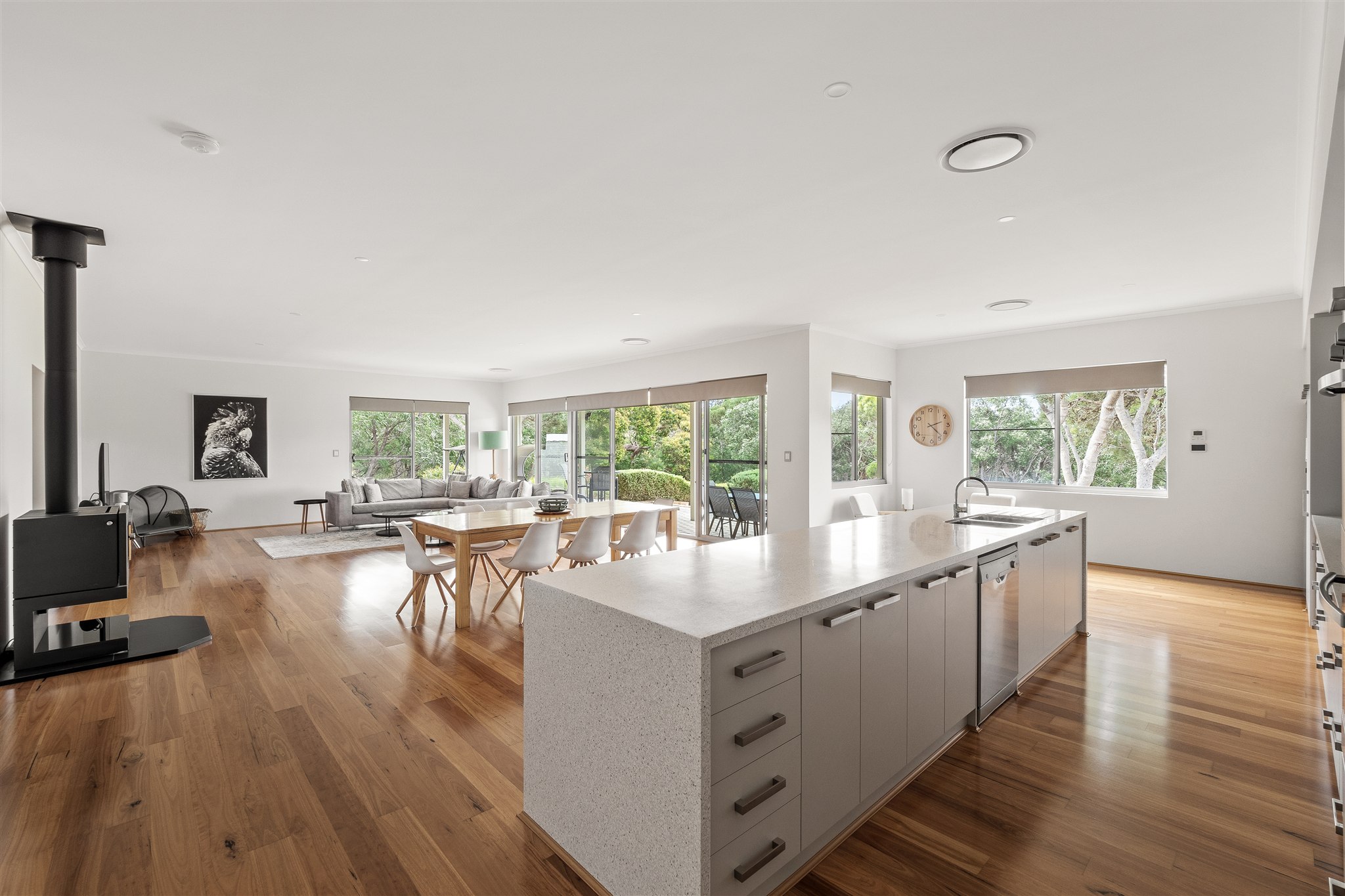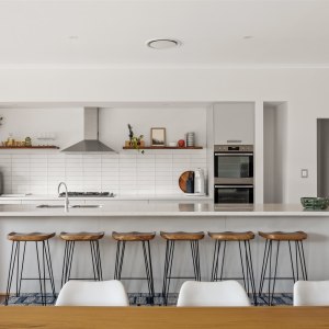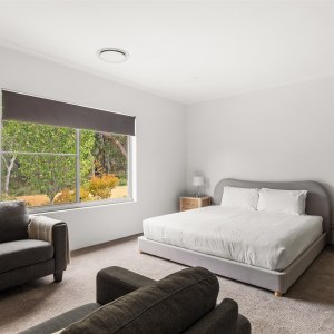 Inside, a chef’s kitchen invites you to slow down and savour the moment, whether you’re cooking local produce on the gas stovetop or sharing a bottle of wine at the Corian island. Two living zones provide space for both connection and retreat, while wraparound alfresco areas open wide to the landscape beyond.