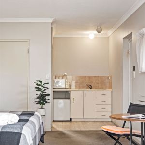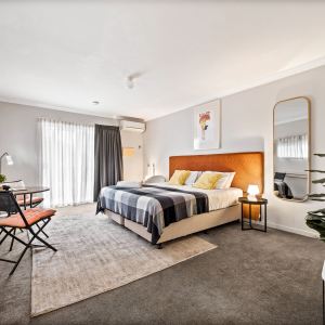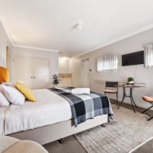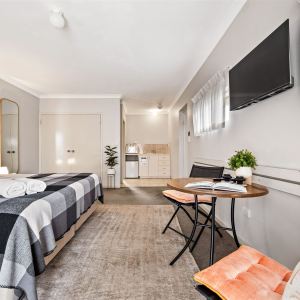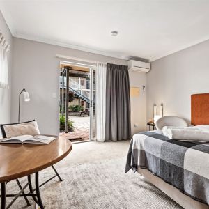 Stay in a great location at the centre of town, the first level apartment is perfect for one or two people. Fitted with all you will need for your holiday escape the open plan space is designed with a spacious king bed, ensuite, fresh linens & towels, a kitchenette including microwave & coffee and tea making facilities, sitting table and chairs and television, all designed to help you relax in the space and enjoy your holiday.
