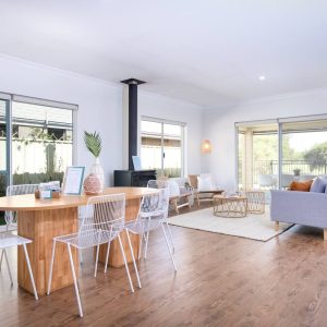 The open plan kitchen, living and dining area flows seamlessly onto the expansive alfresco overlooking the golf course. In Winter, relax in front of the wood fire and in Summer enjoy outdoor entertaining on the spacious alfresco.