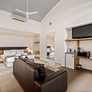With high vaulted ceilings, there is a sense of space in the apartment, with all you need for your holiday in the centre of town. A spa bath and full bathroom, and a sitting area to relax while watching the TV, and all you would expect in an apartment.