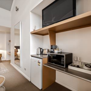 There are tea and coffee making facilities, with a microwave, and then an iron and ironing board, space to hang clothes, and a work area.