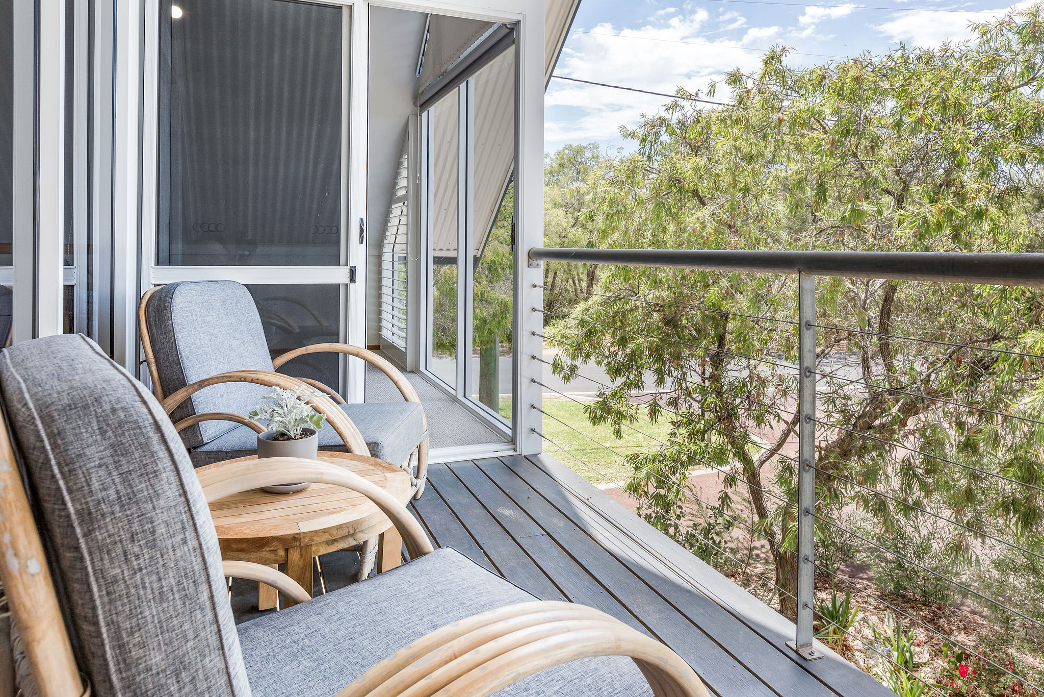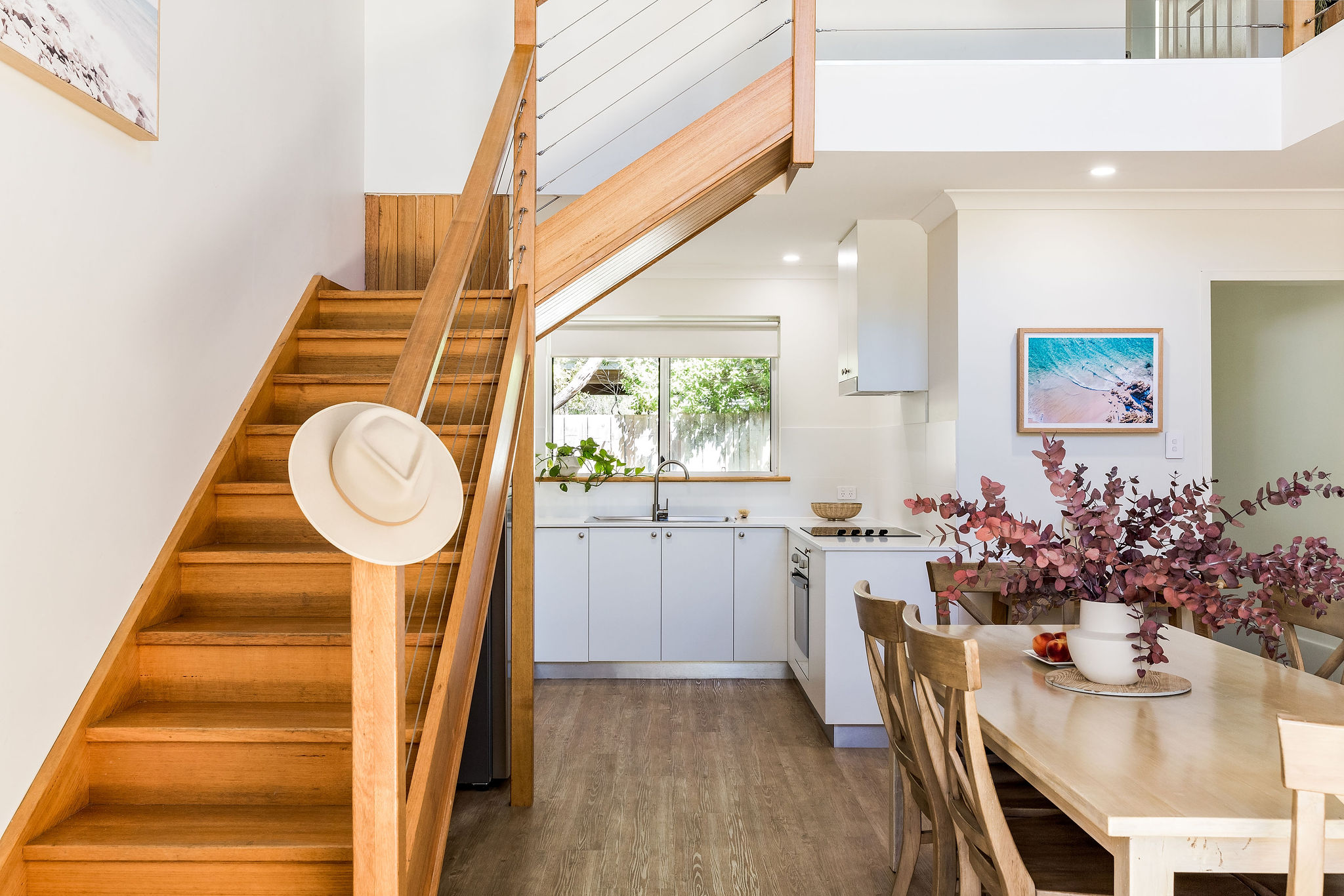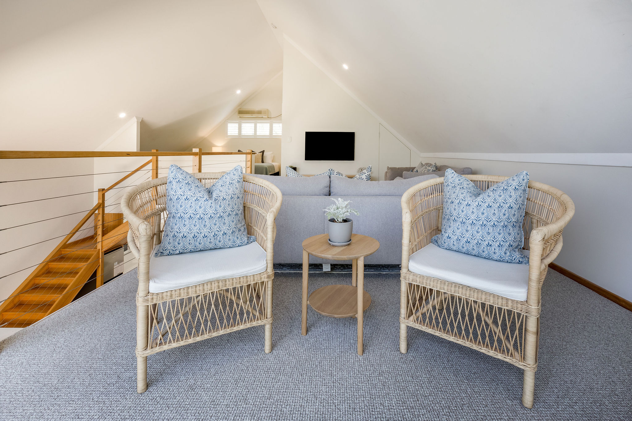 The home is well designed to accommodate two families, with the living area upstairs, and seating on the balcony, read while the kids watch a movie. This home is designed to allow the morning and evening light, and to capture the cool evening breezes, with air conditioning and heating throughout. A fully equipped kitchen, compliments the space & comfortable sitting areas with easy access to the outdoor spaces to sit or where you can barbecue in amongst the peppi trees. Each living space has TVs with Netflix connected.