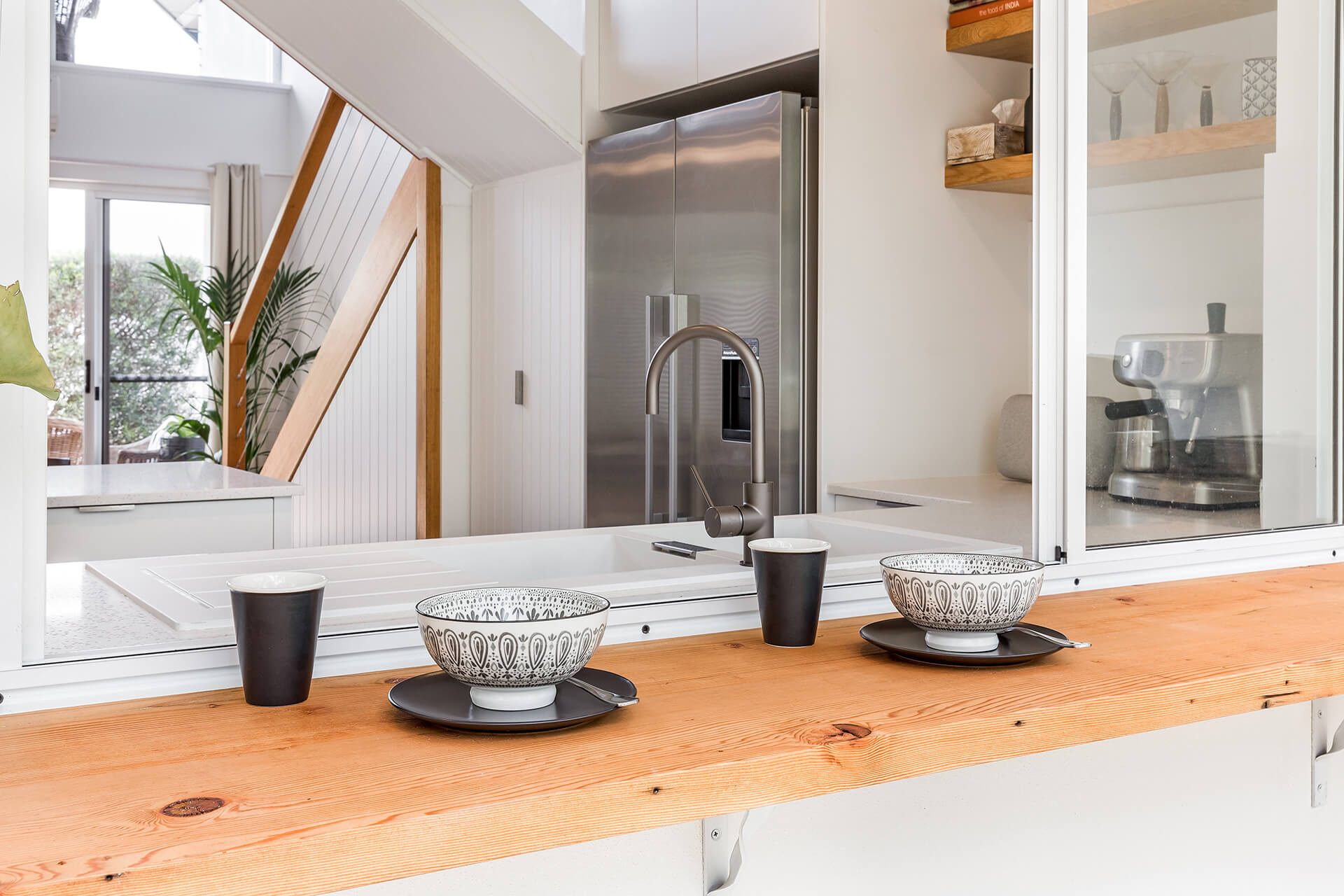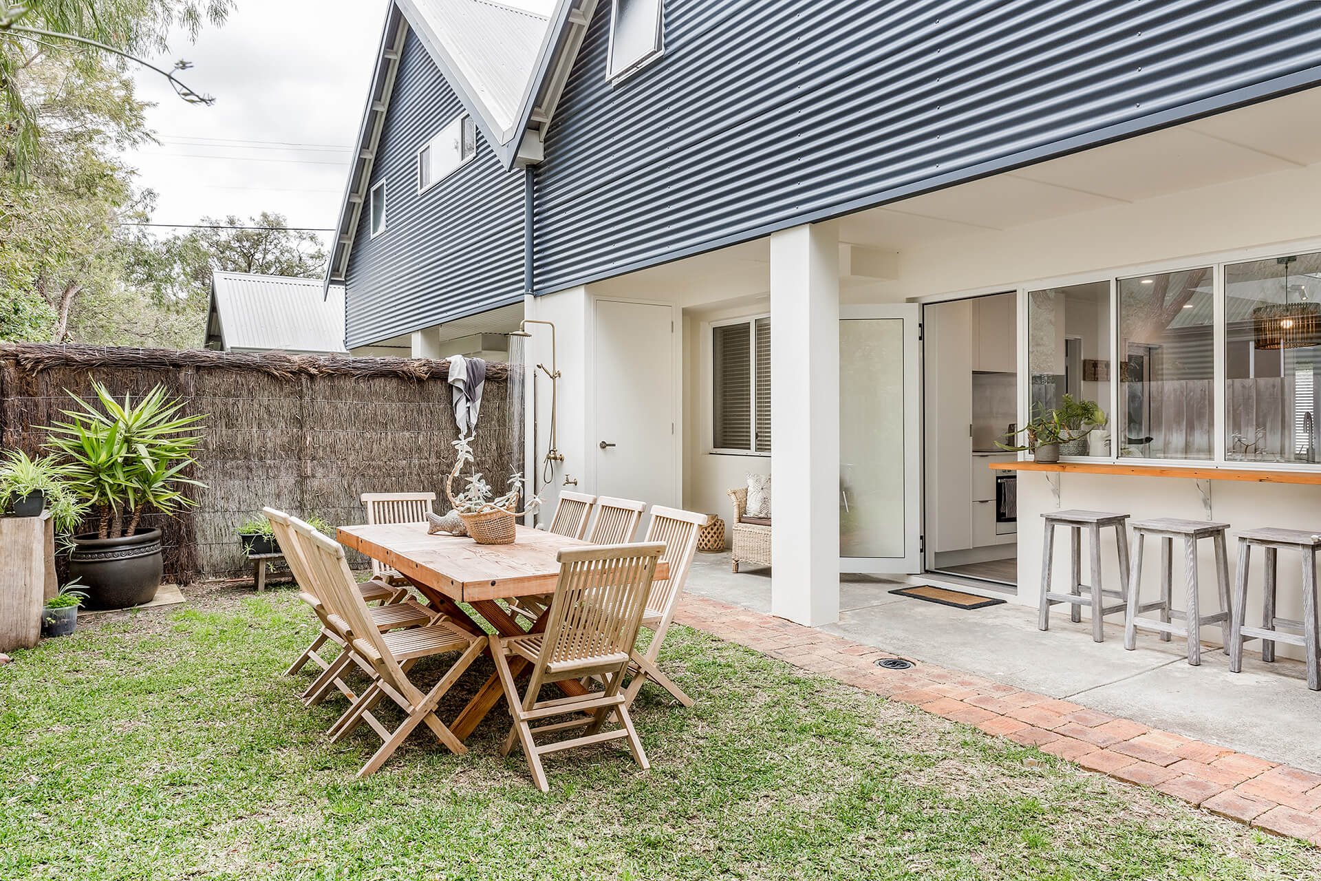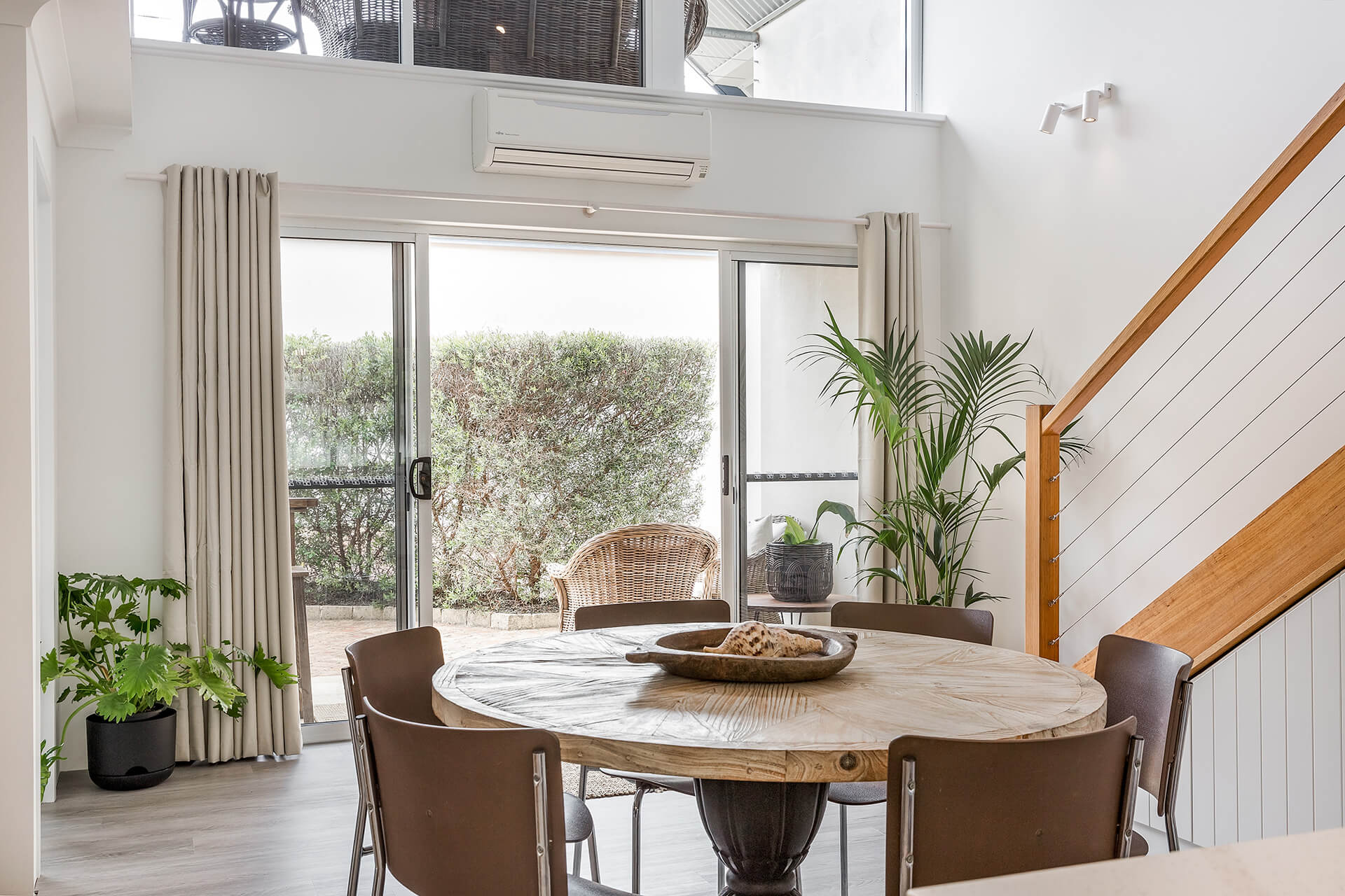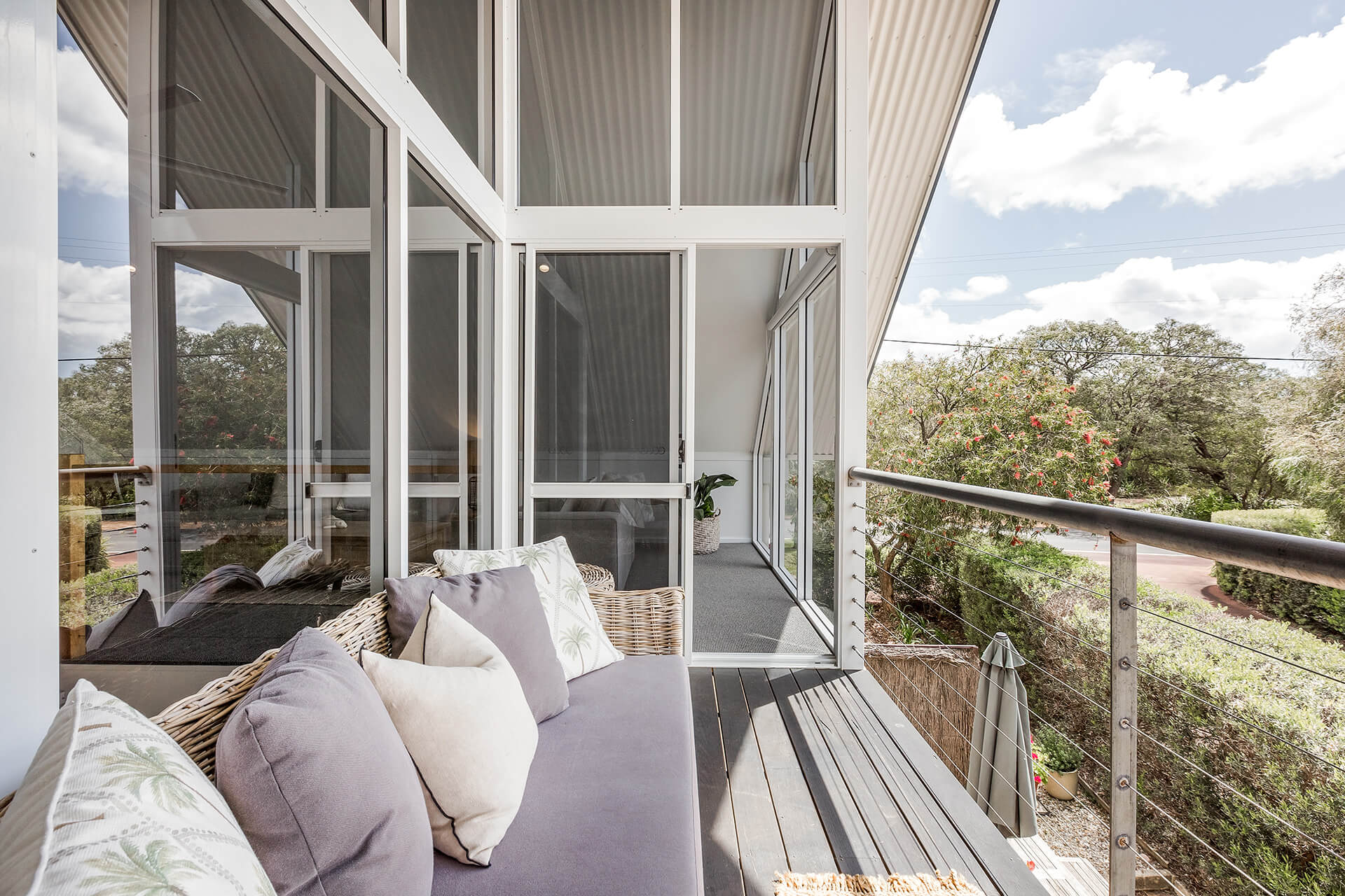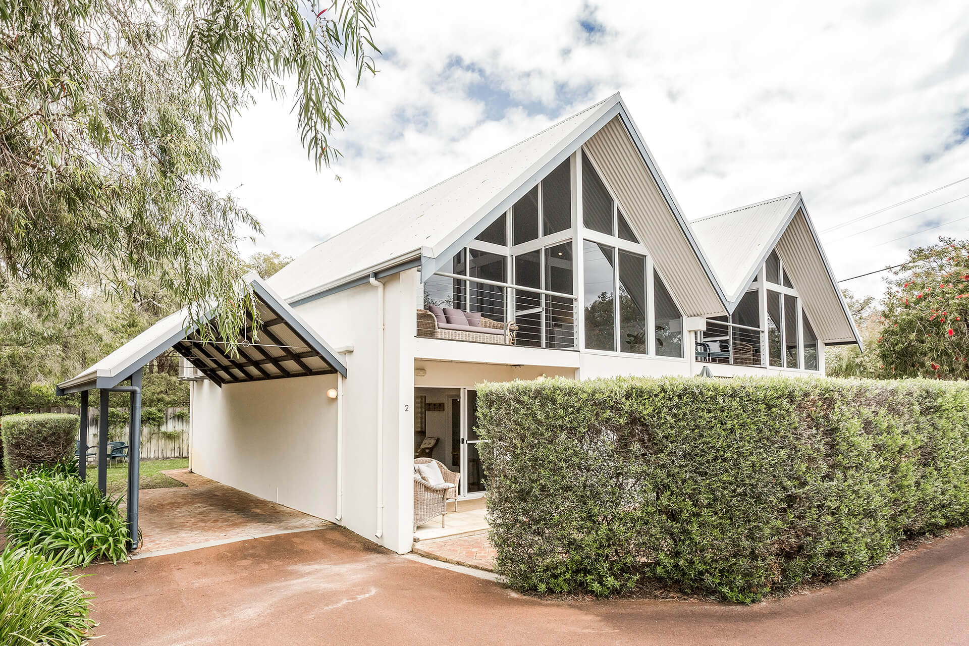 The home is well designed to accommodate two families, with the living area upstairs, and seating on the balcony, read while the kids watch a movie. This home is designed to allow the morning and evening light, and to capture the cool evening breezes, with air conditioning and heating throughout. A fully equipped kitchen, compliments the space & comfortable sitting areas with easy access to the outdoor spaces to sit or where you can barbecue in amongst the peppi trees. Each living space has TVs with Netflix connected.