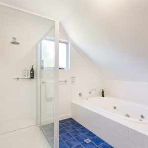 The property offers two beautifully appointed spacious king bedrooms and a third with either a king bed or two single beds all prepared with crisp linens. The master bedroom opens to beautiful views and direct access to the veranda and shares the bathroom, fitted with a jet bath, with the second bedroom. These rooms are located on the second level.
