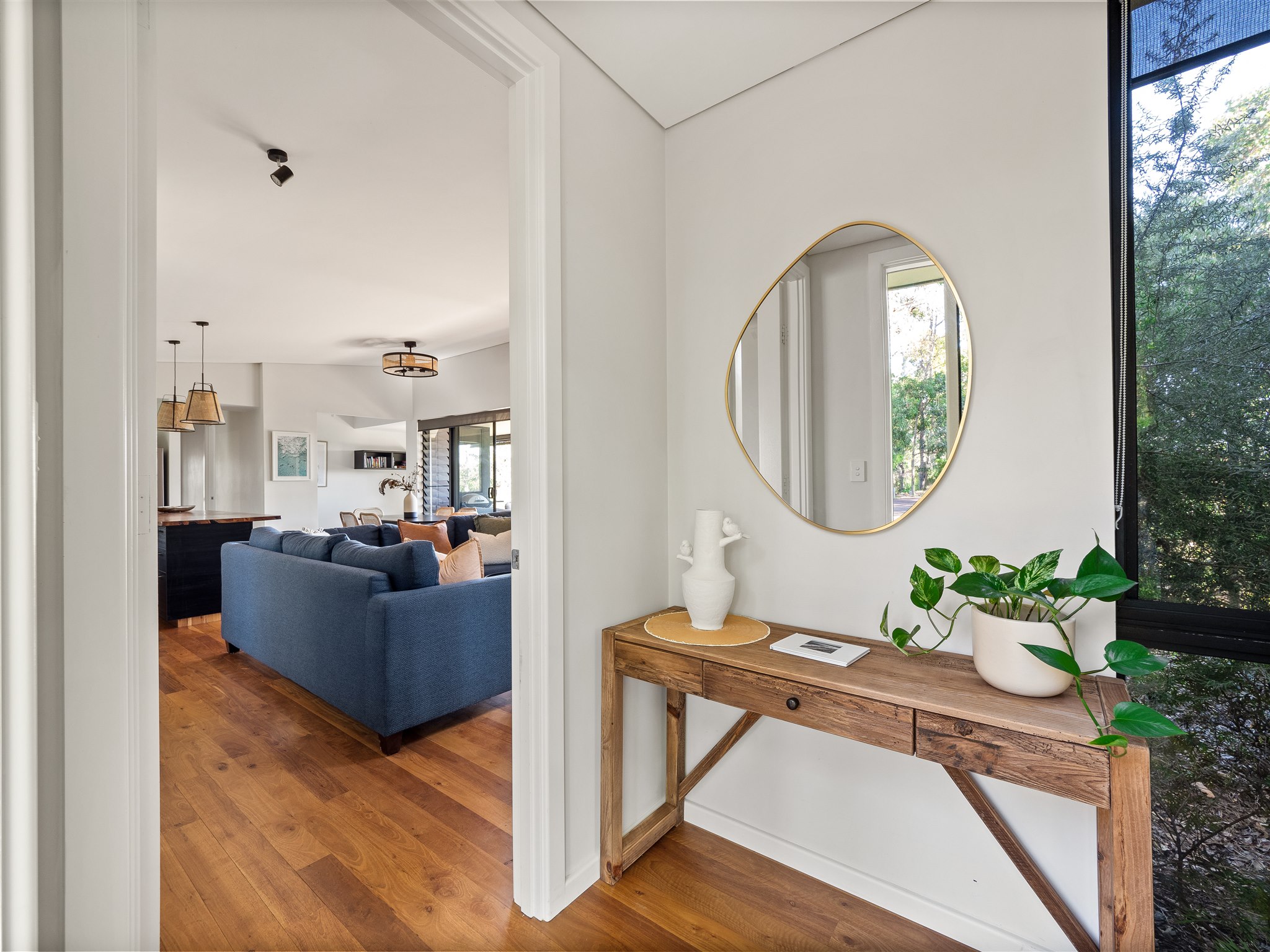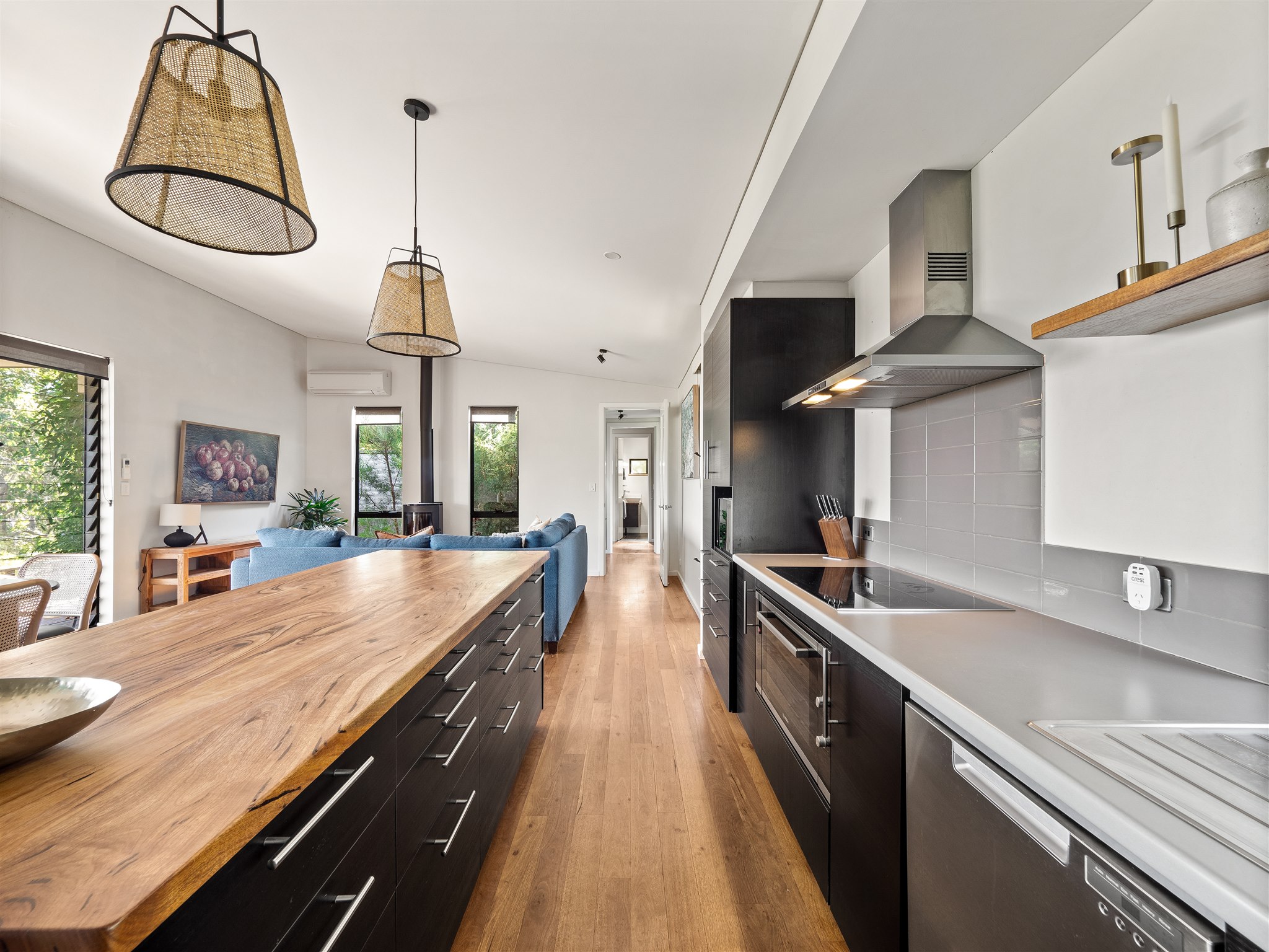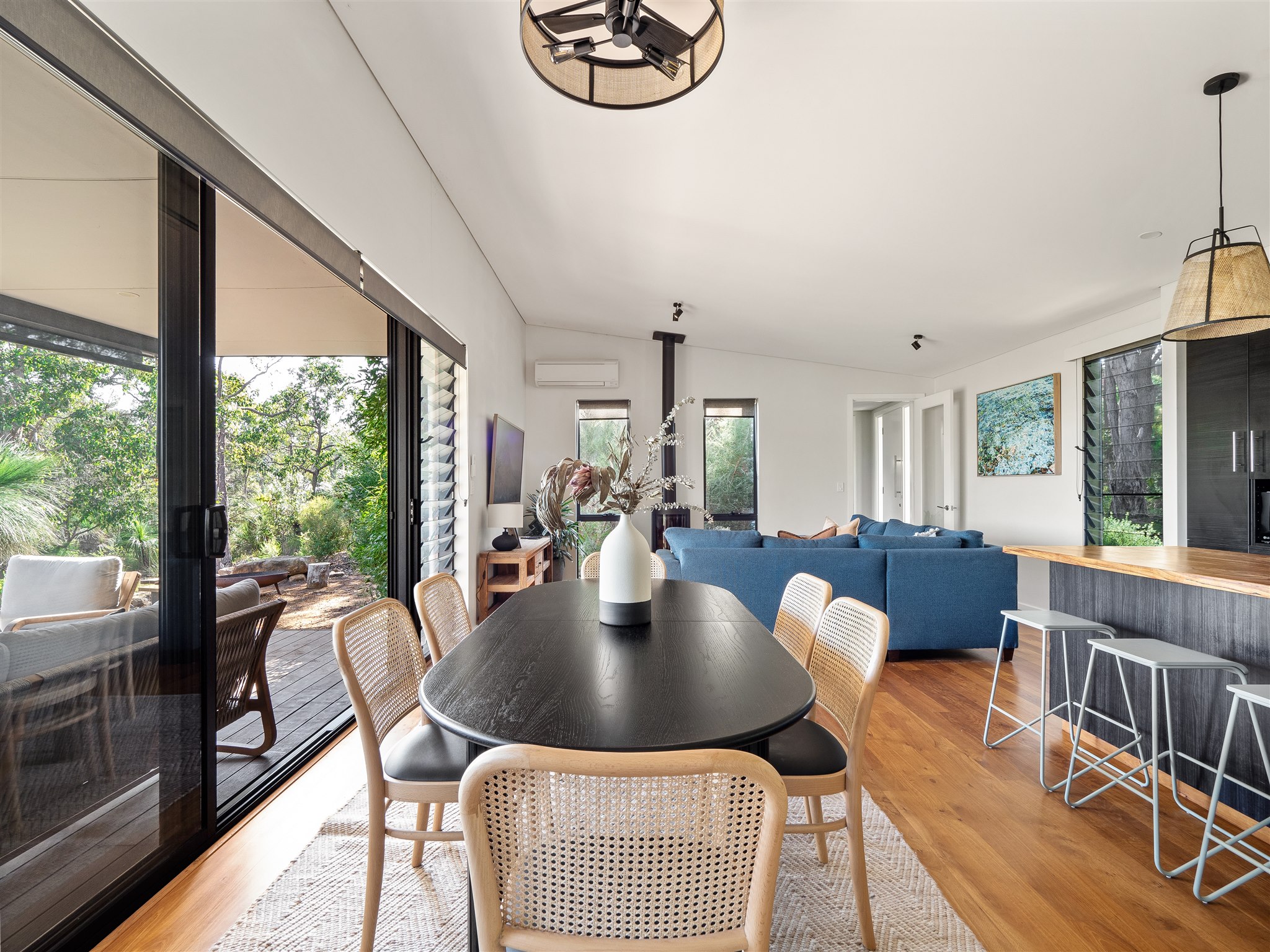 This thoughtfully designed property offers three bedrooms and two bathrooms, including a master suite with a private ensuite, kitchenette, and deck access. Perfectly suited for up to 8 guests, it features Blackbutt timber floors, Marri benches, and high-quality furnishings throughout. The open-plan kitchen and dining area flow seamlessly into the cozy living space with a Masport wood stove, creating an inviting atmosphere for gatherings. Step outside to find multiple outdoor spaces for entertaining and relaxation. Enjoy morning coffee on the deck, evening stories around the firepit, or cook up a feast on the BBQ. The low-maintenance native garden and private walking trail enhance the connection to the surrounding natural beauty.